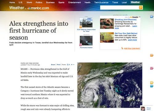 Pretty bold move for a mainstream new source, in my opinion. First off, the entire article is one one page, as opposed to the multi-paging most news sites use to pump up page views. Big bold headlines, large line height for easy reading, tons of white space. Also, innovative navigation in the right margin, with the little icons that indicate where on the page different features reside.